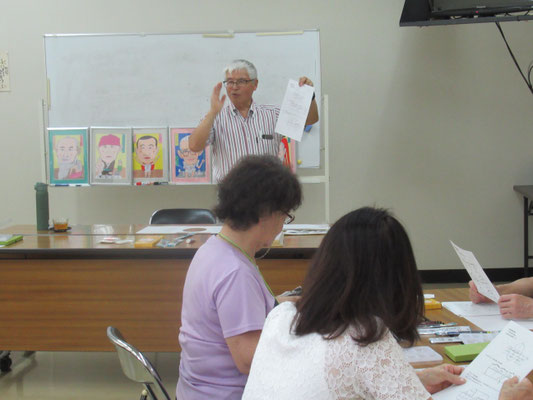 講師の先生が、顔のバランスの取り方や表情の捉え方など、似顔絵を描くための基本的なコツを、ユーモアを交えながら丁寧にレクチャーしてくださいました。