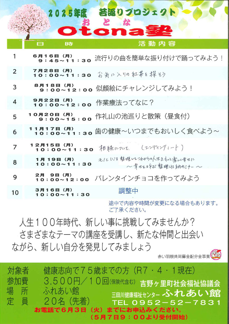 昨年度も行いましたが、2025年度 若返りプロジェクト Otona(おとな)塾を、下記の内容で開催いたしました。